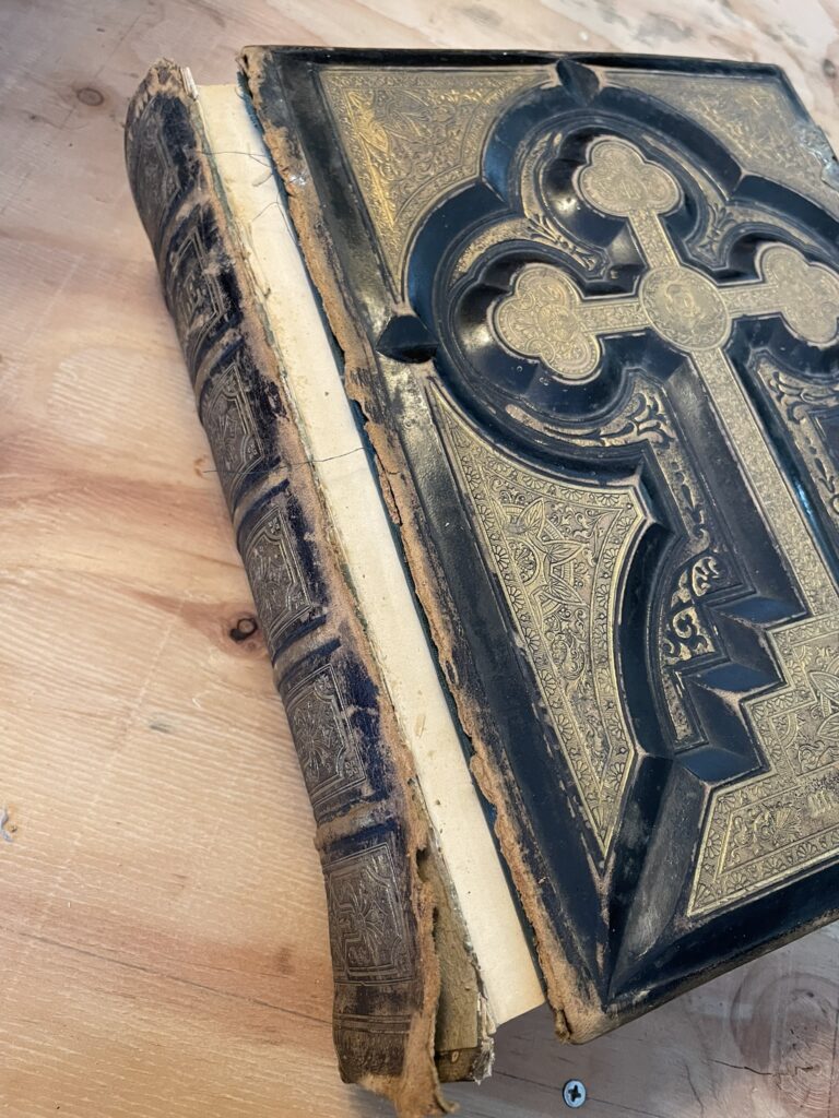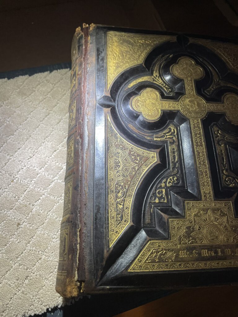 Front cover board reattached to an 1874 Bible published by Thomas Kelly, New York City